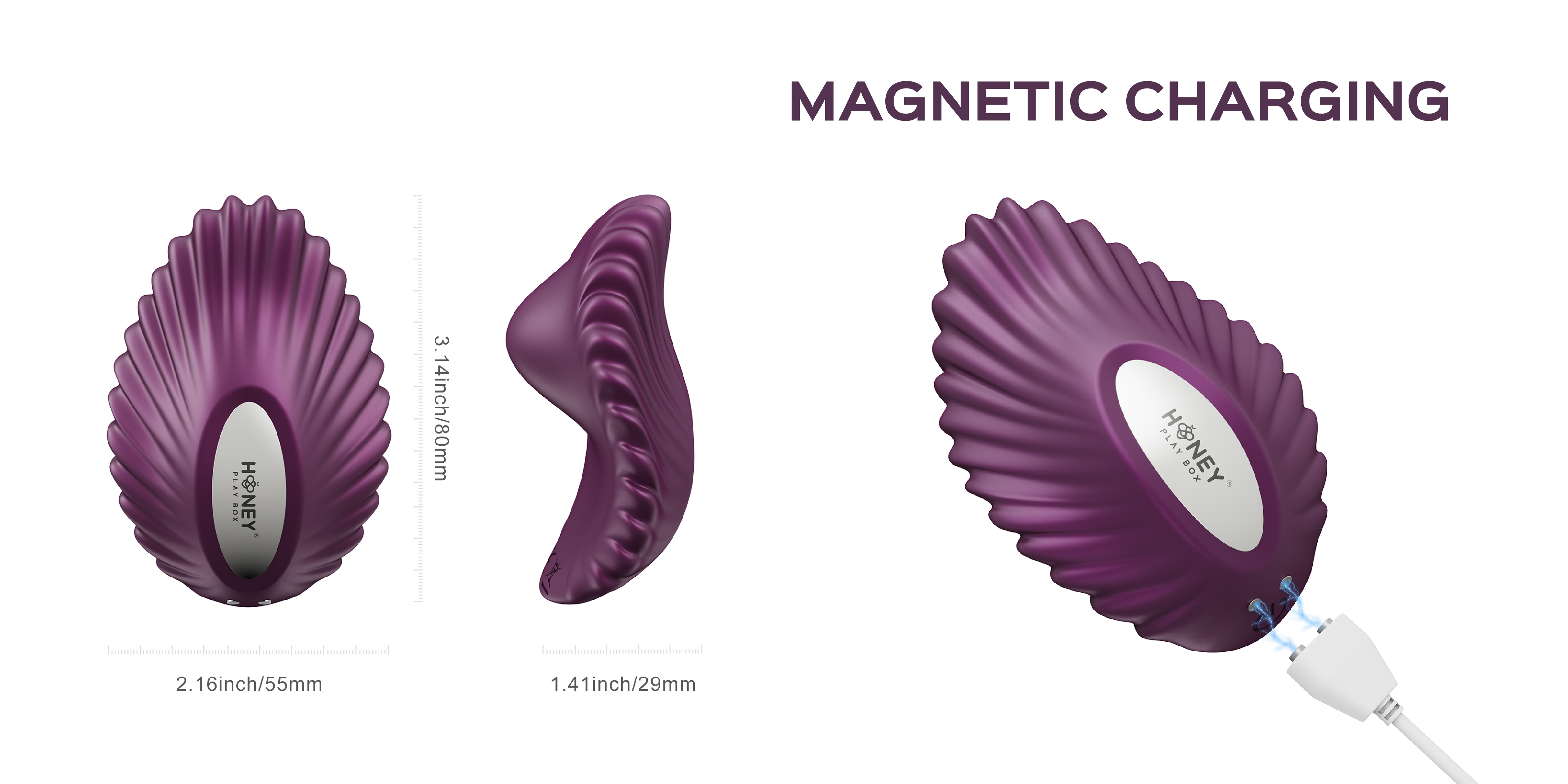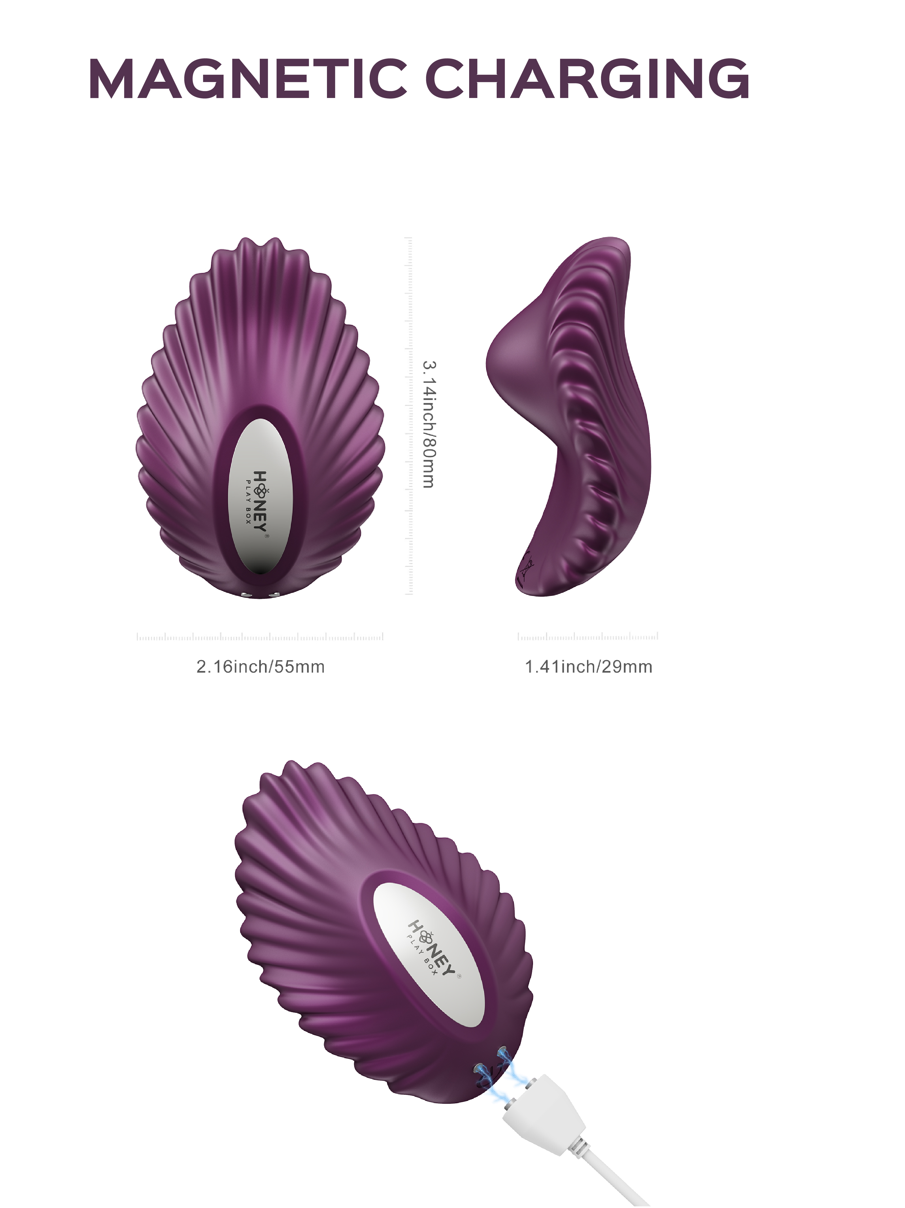 Redefine pleasure with a blend of luxury and innovation! Delicately shell-shaped with a captivating pearlescent touch, this dainty pant vibrator nestles against your (or your partner’s) hot spots with its ergonomic shape. Position it, then clip the magnet to the outside of your panties for non-slip enjoyment! Sync it with the APP and transform your night into something utterly enchanting, even across long distances!