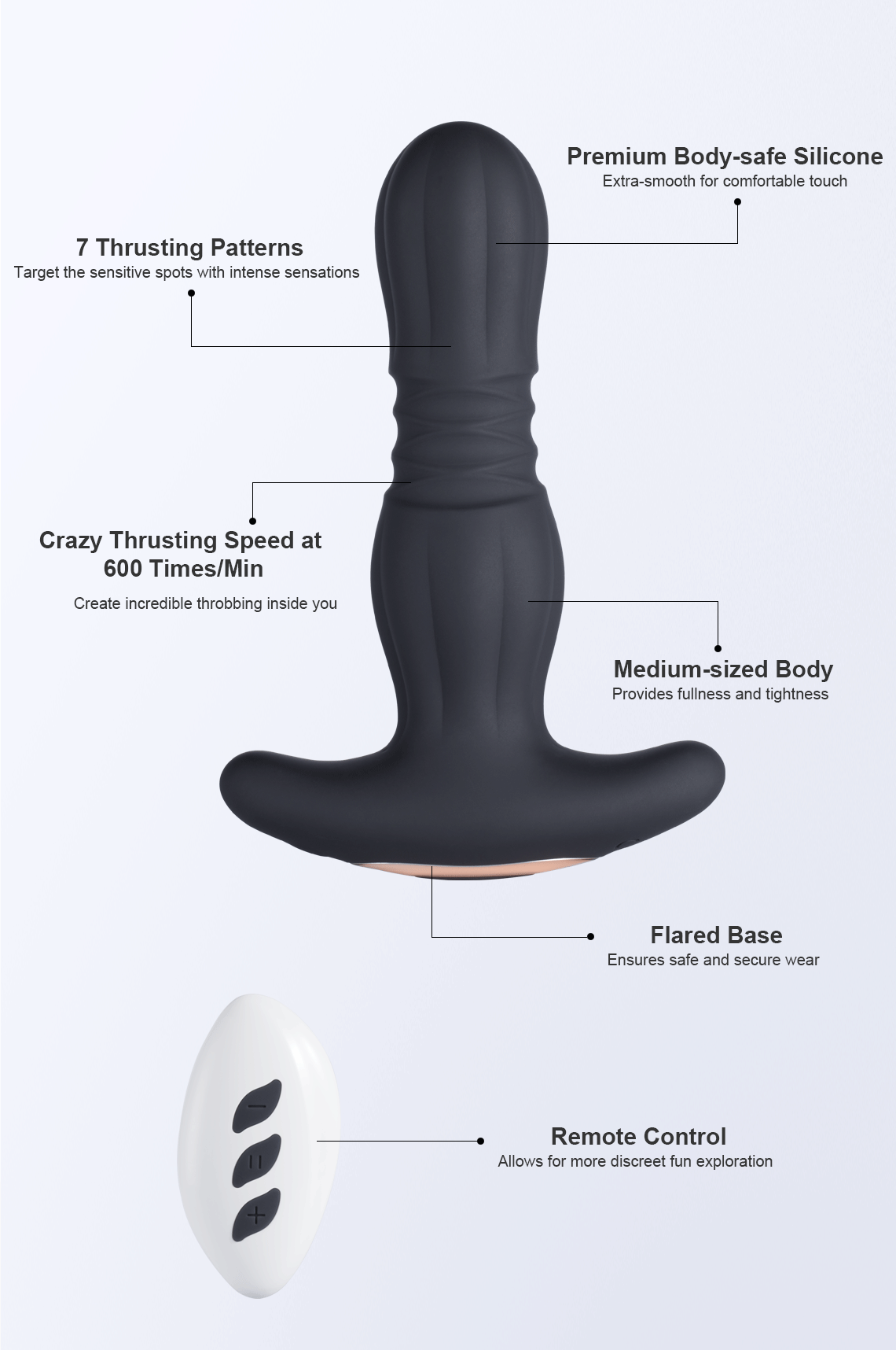 Agas is our new best anal pleasure stroker strikes with thumbing thrusts at an unrivaled speed of 600 times per minute! More powerful and speedy than any traditional butt plugs. This high-energy anal plug has a firm body and folded wrapping skin to allow the plug body to thrust up and down, inside your ass! It’s made with an anchor-shaped base for safe and secure wear; you can wear it either anally or vaginally; the remote control enables you to navigate the 7 powerful programs easily. Agas is great for teasing, or warmup, and most straightly, for orgasm by itself. With the stretch and fullness back there, You can create all sorts of sensations with the high-speed telescopic thrusting and have a more pleasure-packed time either alone or with partners.