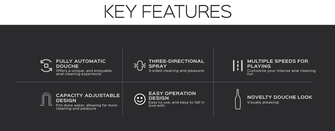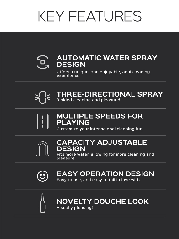 Introducing our Electric Douche Cleansing System: a simpler solution for anal douching. Designed exclusively for pleasure-seekers, just fill the cup, lubricate the nozzle, and press the button to activate. Easily cycle through 5 speeds of flow with a simple press.