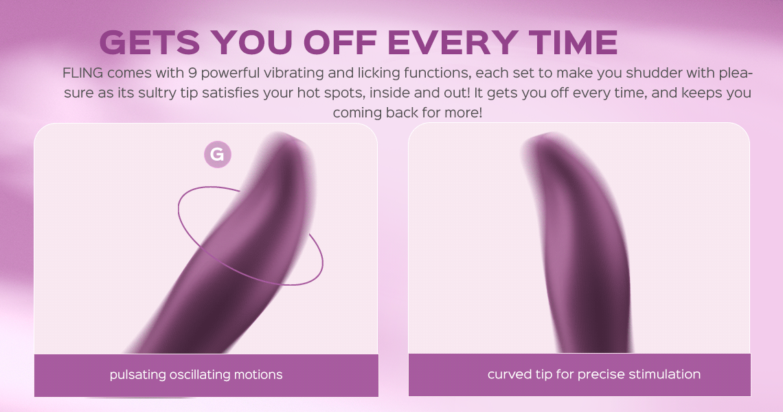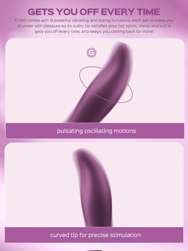 Thanks to its robust motor, FLING delivers 9 sexy and super-satisfying licking and vibrating patterns. The quick and robust oscillating motions target your internal and external hotness with intense stimulation, making your toes curl with delicious pleasure! Its silky silicone curved tip finds your sensitive spots easily, sending all the outstanding vibes directly to your G-spot or any other areas for intense pleasure!