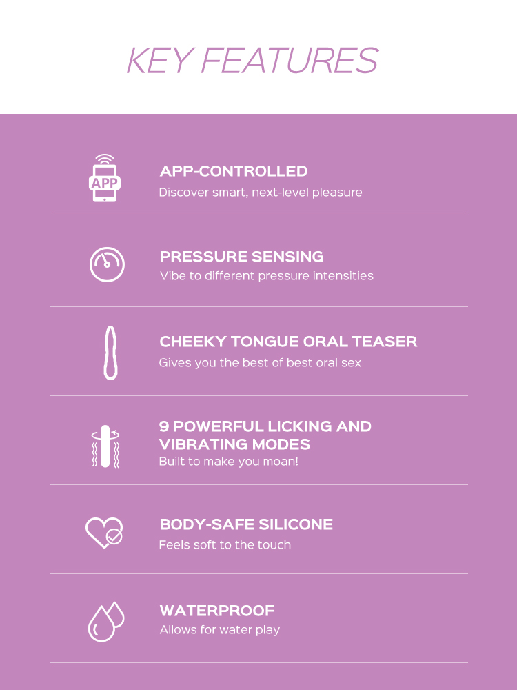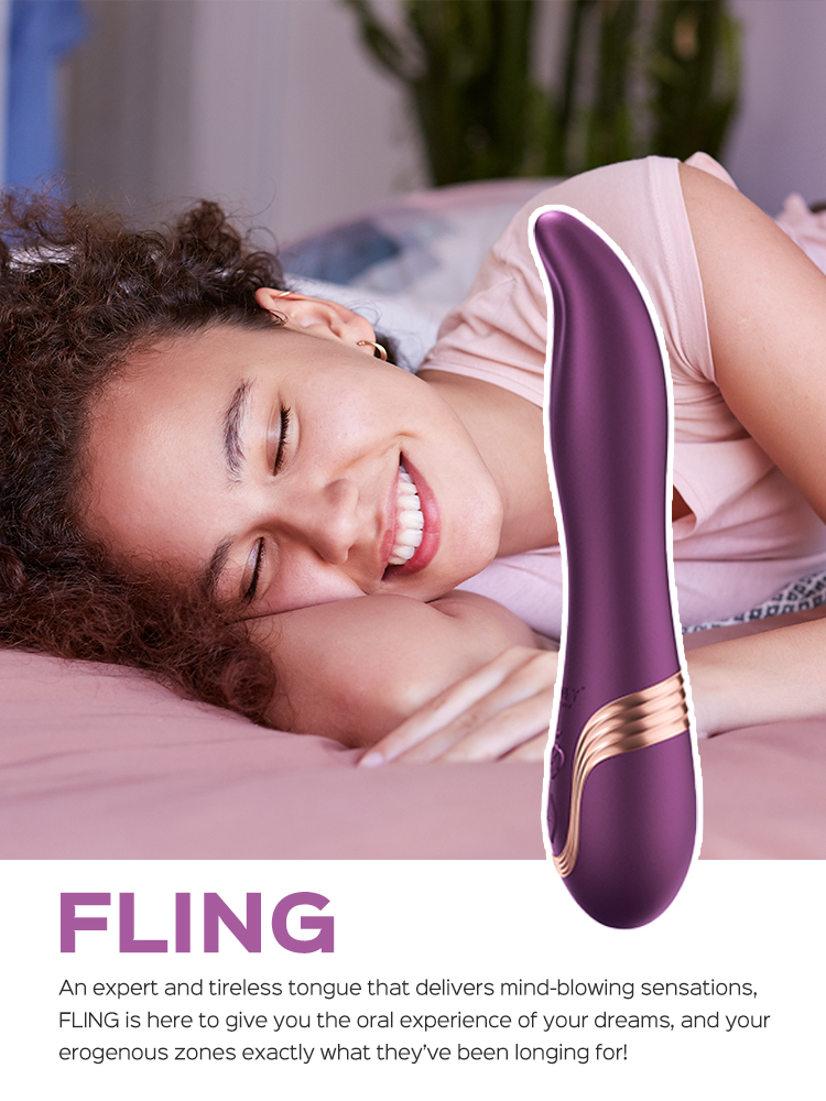 Lucky you! With FLING at your service, you’ll never have to endure a night without oral sex ever again! This sassy vibe gives you the gift of perfect oral pleasure with a fierce tongue that never, ever gets tired. Equipped with pressure sensors along its handle, FLING lets you experience dynamic vibrations that change their intensity with the pressure you apply. The greater the pleasure, the more intense the vibration. Turn it on, and discover what all the buzz is about!