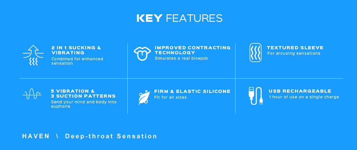 Welcome to the new and enhanced vacuum-like contracting technology. Haven masturbator cup combines sucking and vibrating to bring you mind-numbing sensations. Well-crafted with a tight but supple sleeve, Haven firmly grips and surrounds your penis like no other.