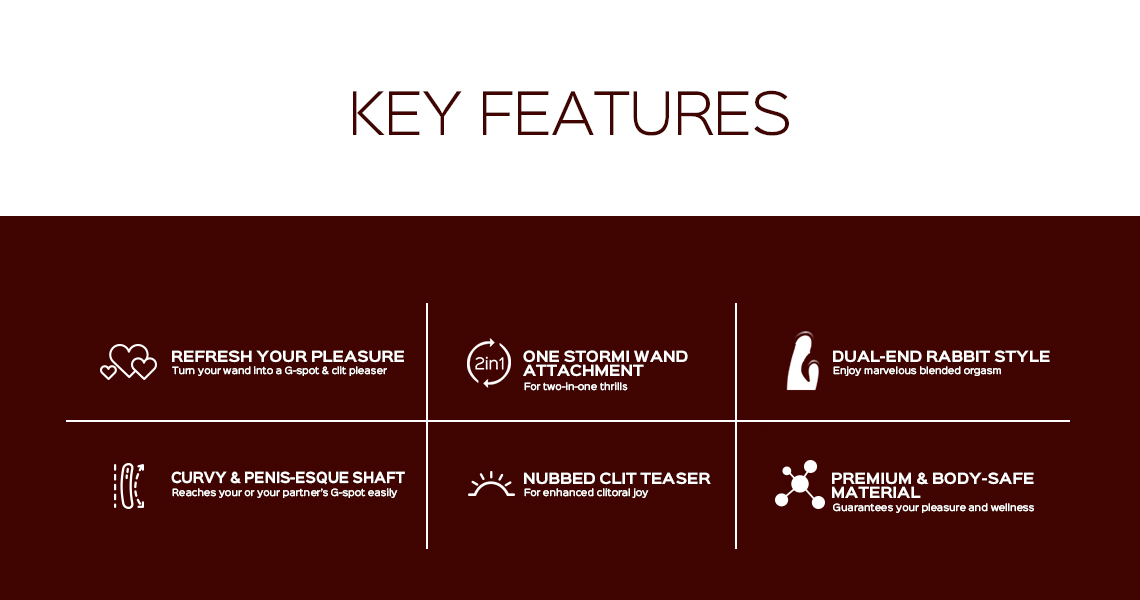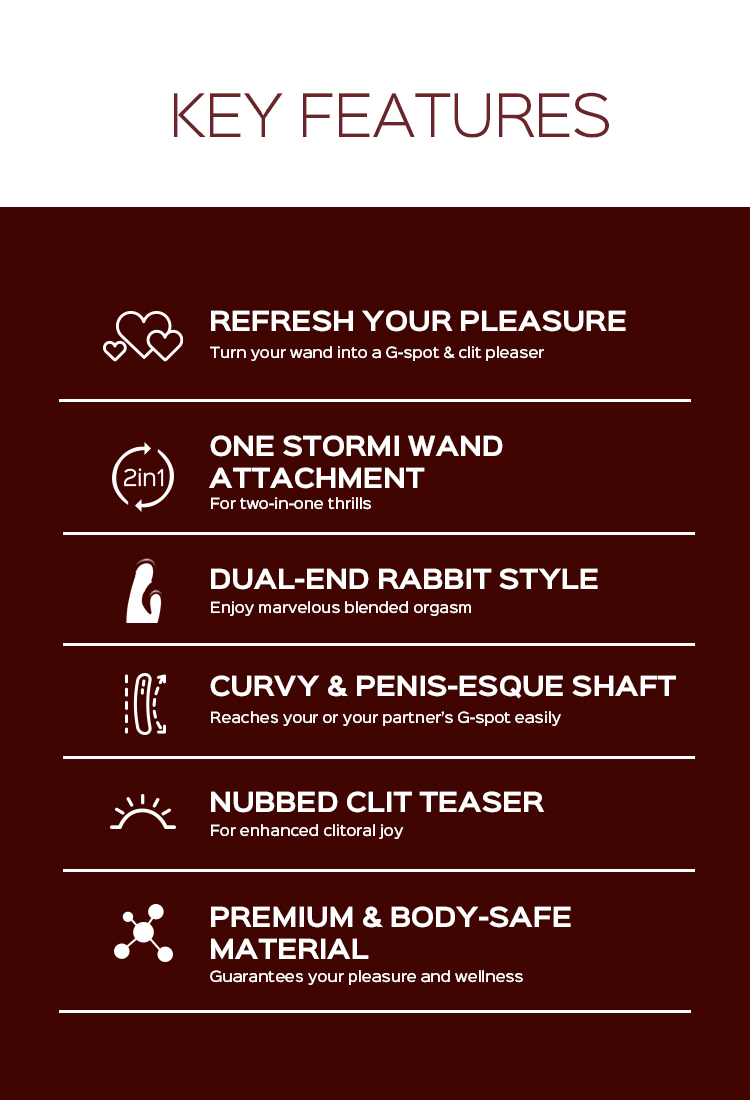 Want the delightful pleasure of two kinds of stimulation with just one wand? This is the perfect attachment for you! Exclusively designed for STORMI wand, HOP instantly transforms your want into a powerful G-spot and clitoral-stimulating bunny, letting you enjoy internal and external gratification at the same time! What’s not to love about this cute bunny?