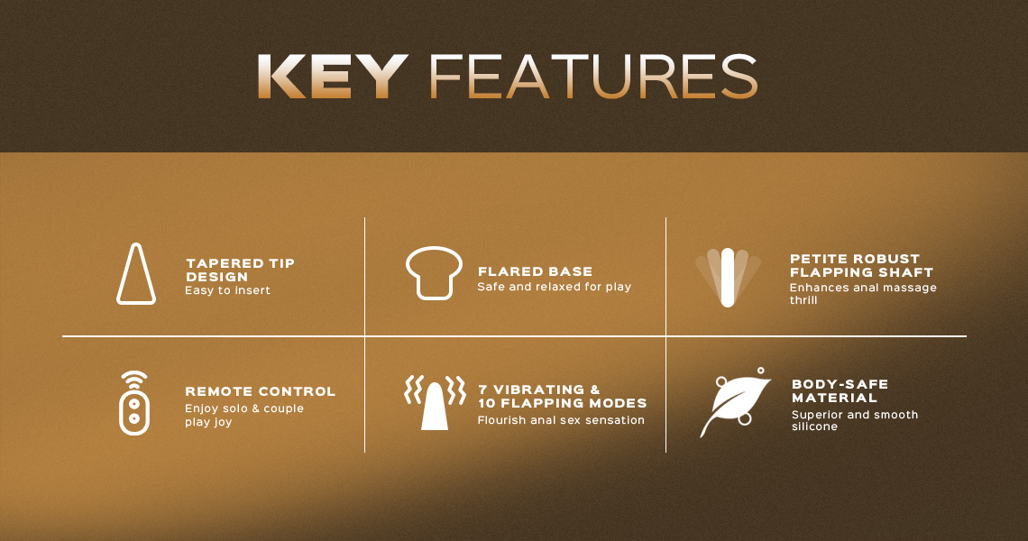 SNUGGY is characterized by its unique hollow tapered silhouette and petite robust shaft that flaps back and forth in 10 patterns, teasing sensitive anal spots during penetration. Combined with the tapered silhouette vibrating in 7 modes, you'll experience nasty anal play like never before, leading to unforgettable anal orgasms. Try the gentle to wild patterns and discover your tail-shaking exhilaration.